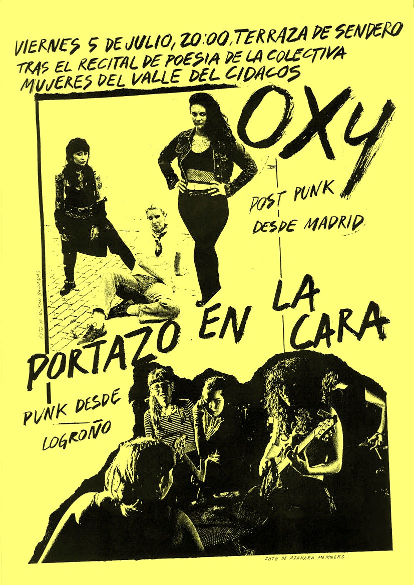Oxy – «Somos una banda de 3 chicas de Madrid. Hacemos punk y hablamos de temas que nos preocupan como el colapso medioambiental y sus consecuencias, los peligros de andar sola de noche, de anhelos y cuestiones existenciales. Escribimos en inglés y castellano.»