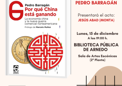 El próximo lunes 15 de diciembre, a las 19 h, Pedro Barragán, autor del libro Por qué China está ganando, contestará a la pregunta que da título a su libro, y hablará sobre la economía China actual y la nueva guerra comercial norteamericana. Economista, experto en relaciones internacionales y miembro de Cátedra China, aportará claves para comprender cómo China ha pasado de ser una economía pobre a convertirse en la segunda economía más grande el mundo.