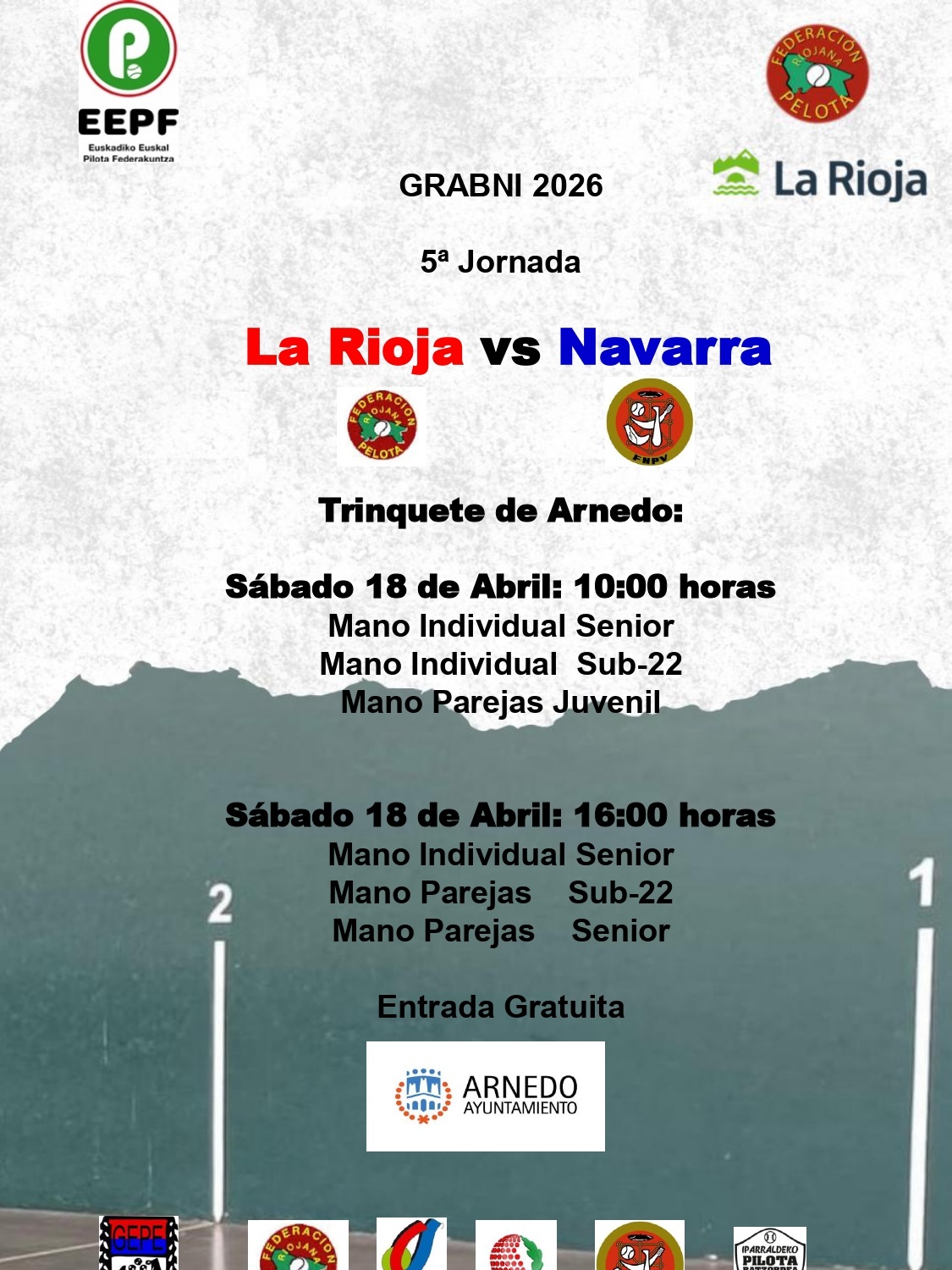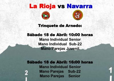 5ª Jornada del Torneo de Pelota Mano en diferentes categorías, que se va a disputar en el Trinquete de Arnedo, enfrentando a la Federación Riojana contra la Navarra.