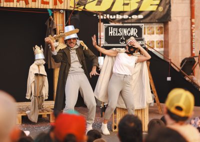 A las 20:30 horas, el festival contará con el espectáculo de calle “Welcome & Sorry” de la compañía Ganso & Cía. La obra es una parodia cómica del clásico Hamlet, en la que dos entusiastas del teatro intentan representar la famosa obra de Shakespeare, a pesar de no tener el talento ni las habilidades necesarias. En su intento, y a pesar de los fallos y la falta de recursos, la comedia se convierte en una lección de perseverancia y humor, invitando al público a disfrutar del teatro de una forma fresca y divertida.