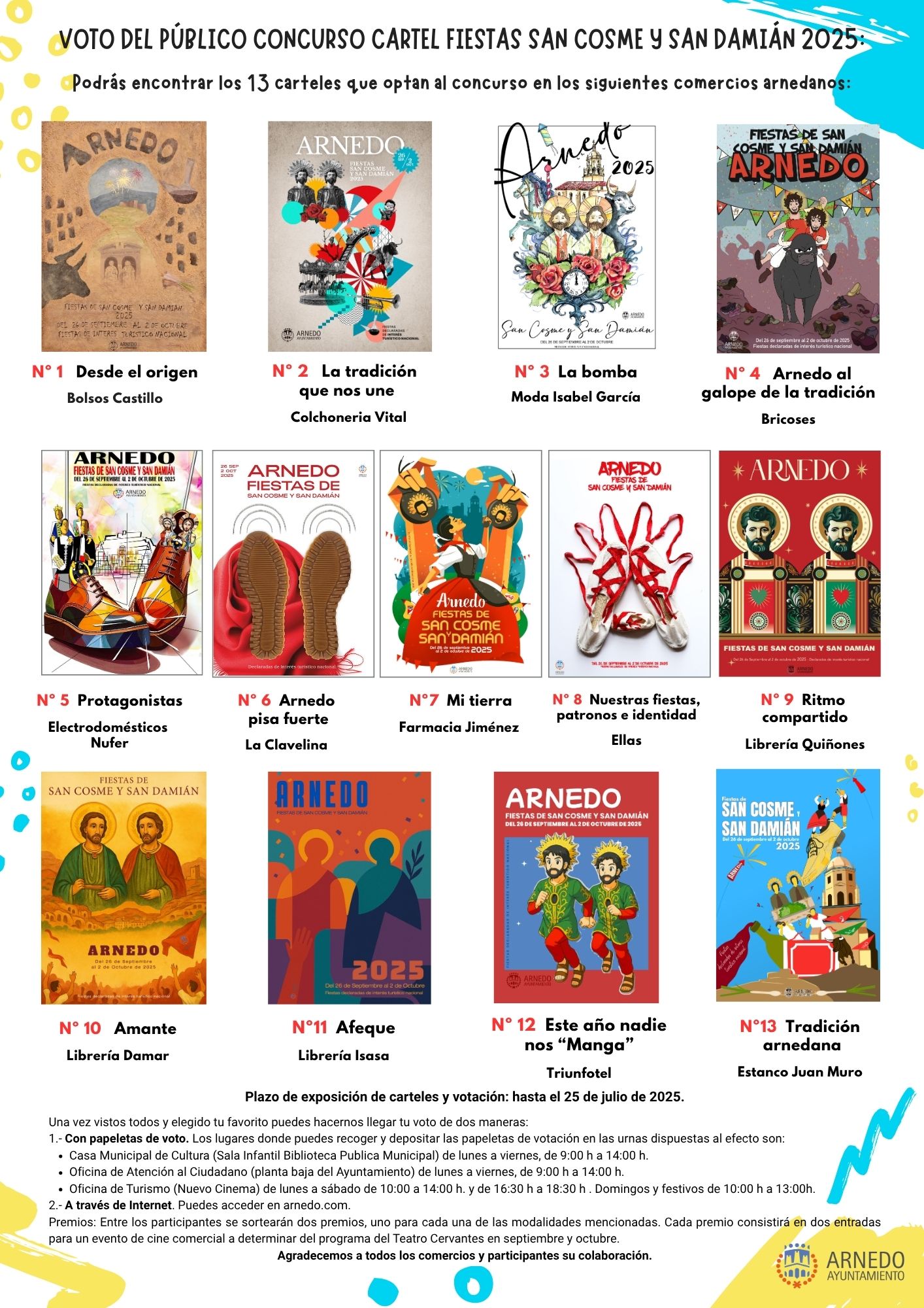 La concejal de Cultura, Mª Jesús Zapata, ha informado del inicio del periodo de votación popular para elegir el cartel anunciador de las próximas Fiestas de San Cosme y San Damián 2025. Un año más, los carteles participantes en el tradicional concurso se exponen al público tanto en distintos comercios de la ciudad como en la web municipal, con el objetivo de acercar estas propuestas a la ciudadanía y fomentar su implicación en la elección del cartel oficial.