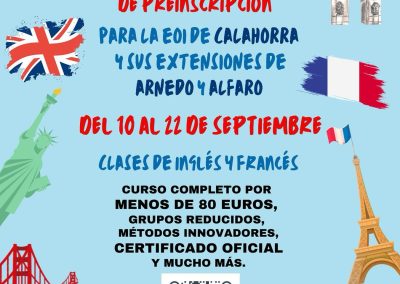La Escuela Oficial de Idiomas de Calahorra, junto con sus extensiones en Arnedo y Alfaro, mantiene abierto hasta el 22 de septiembre el plazo de preinscripción en enseñanza presencial para alumnos de nuevo ingreso.