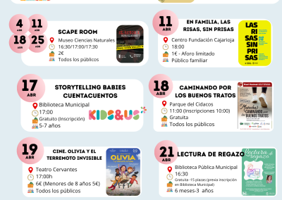 A lo largo del mes, la agenda ofrece una variada propuesta de ocio educativo y cultural. Destacan las sesiones de “Escape Room” en el Museo de Ciencias Naturales, previstas para los días 4, 11, 18 y 25 de abril, dirigidas a todos los públicos. El día 11 también tendrá lugar la actividad familiar “En familia, las risas, sin prisas” en el Centro Fundación Caja Rioja, pensada para disfrutar en un ambiente cercano y participativo.