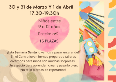 La programación de abril arranca con los talleres de Semana Santa, que se celebrarán los días 30 y 31 de marzo y 1 de abril en el Centro Joven, así como con los talleres “Geo Lab” en el Nuevo Cinema. Ambas iniciativas están dirigidas a público infantil y requieren inscripción previa.
