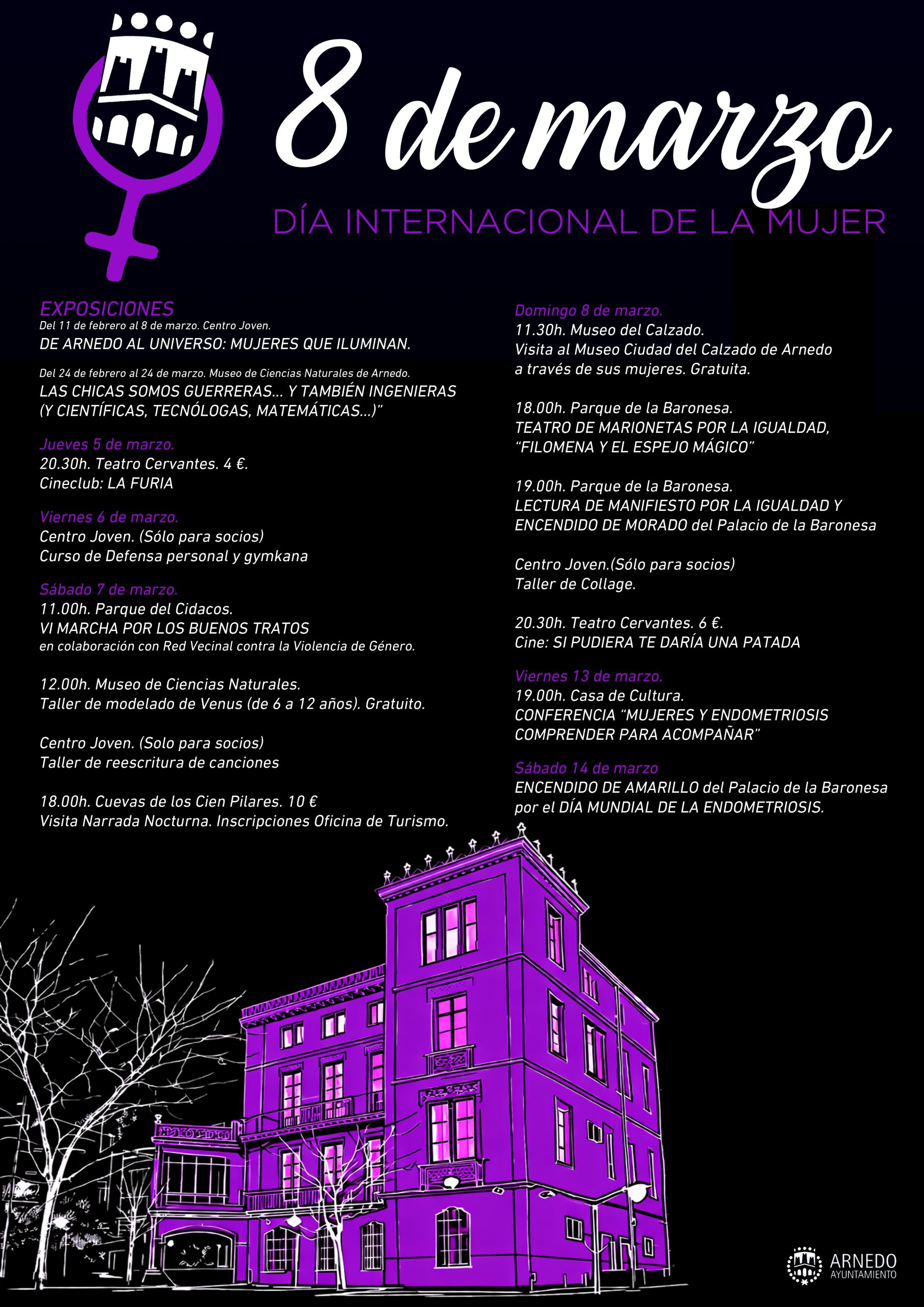 El domingo 8 de marzo, Día Internacional de la Mujer, se concentrarán varios actos centrales. A las 11.30 horas tendrá lugar una visita temática en el Museo del Calzado de Arnedo bajo el título “El museo a través de sus mujeres”. Por la tarde, el Parque de la Baronesa acogerá el teatro de marionetas por la igualdad “Filomena y el espejo mágico”, seguido de la lectura del manifiesto institucional y el encendido del Palacio de la Baronesa como símbolo del compromiso de la ciudad con la igualdad. La jornada concluirá con la proyección de la película Si pudiera te daría una patada en el Teatro Cervantes y un taller de collage en el Centro Joven.
