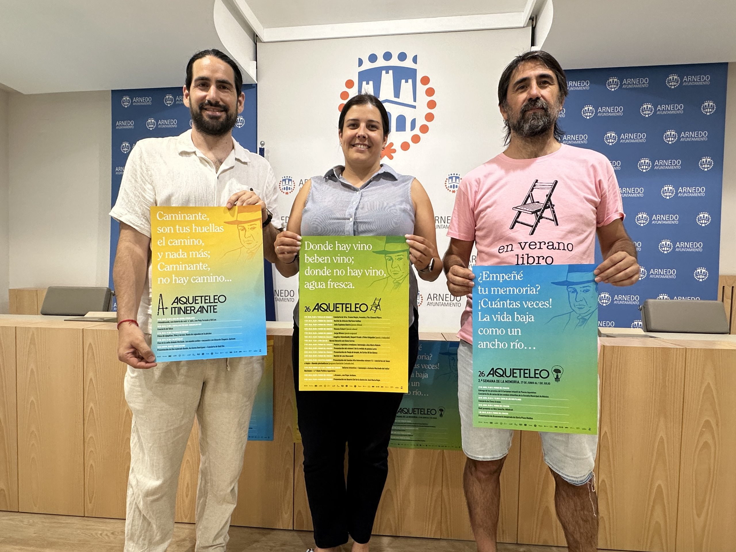 La concejala de Juventud, Sandra Rodríguez, junto a Ánjel Mª Fernández y Javier Martínez-Losa, representantes de la Asociación Aqueteleo, ha presentado en rueda de prensa la 26ª edición de Aqueteleo, el tradicional encuentro con la lectura, la poesía y la palabra compartida que se celebrará durante los meses de junio, julio y agosto en Arnedo.