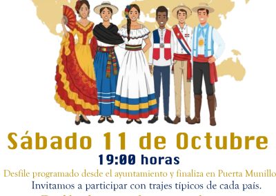 La programación comenzará a las 19:00 horas en la Plaza del Ayuntamiento (Plaza Nuestra Señora de Vico), desde donde partirá el desfile que recorrerá Juan Carlos I, Santo Domingo, República Argentina, Plaza España y Paseo de la Libertad, hasta llegar a la Puerta Munillo, donde se celebrará el acto central con demostraciones de danzas, música y expresiones culturales de los distintos países participantes.