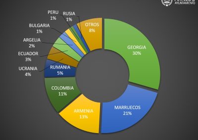 Las siguientes nacionalidades con mayor número de habitantes empadronados son Armenia (13,04%), Colombia (10,70%), Rumanía (5,15%), Ucrania (3,78%), Ecuador (3,14%), Argelia (2,11%), Bulgaria (1,44%), Perú (1,27%) que adelanta a Rusia (1,04%) respecto al año anterior siendo este el único cambio en el ranking de las nacionalidades por encima del 1%, al encontrarse todas las demás por debajo de este umbral. Las otras 30 nacionalidades suponen en su conjunto el 7,53% del total de población inmigrante.