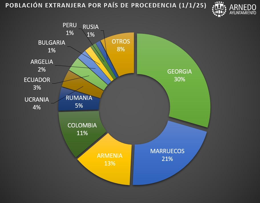 Y más específicamente, atendiendo a sus nacionalidades de origen, en Arnedo podemos encontrar un total de 41 nacionalidades distintas, siendo las más numerosas la georgiana y la marroquí, y es que tres de cada diez habitantes no españoles, provienen de Georgia (29,46%), y dos de cada diez lo hace desde Marruecos (21,34%)