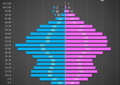 De ellos, 7600 son mujeres (49,91%, 0,04 puntos porcentuales menos que hace un año) y 7639 son hombres (50,13% creciendo en el mismo porcentaje) y la media de edad de la población total se sitúa en los 43,11 años, 0,51 años más que hace doce meses. Las franjas de población que superan el millar de habitantes son las comprendidas en los tramos entre 40-45 y 60-64 años.
