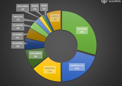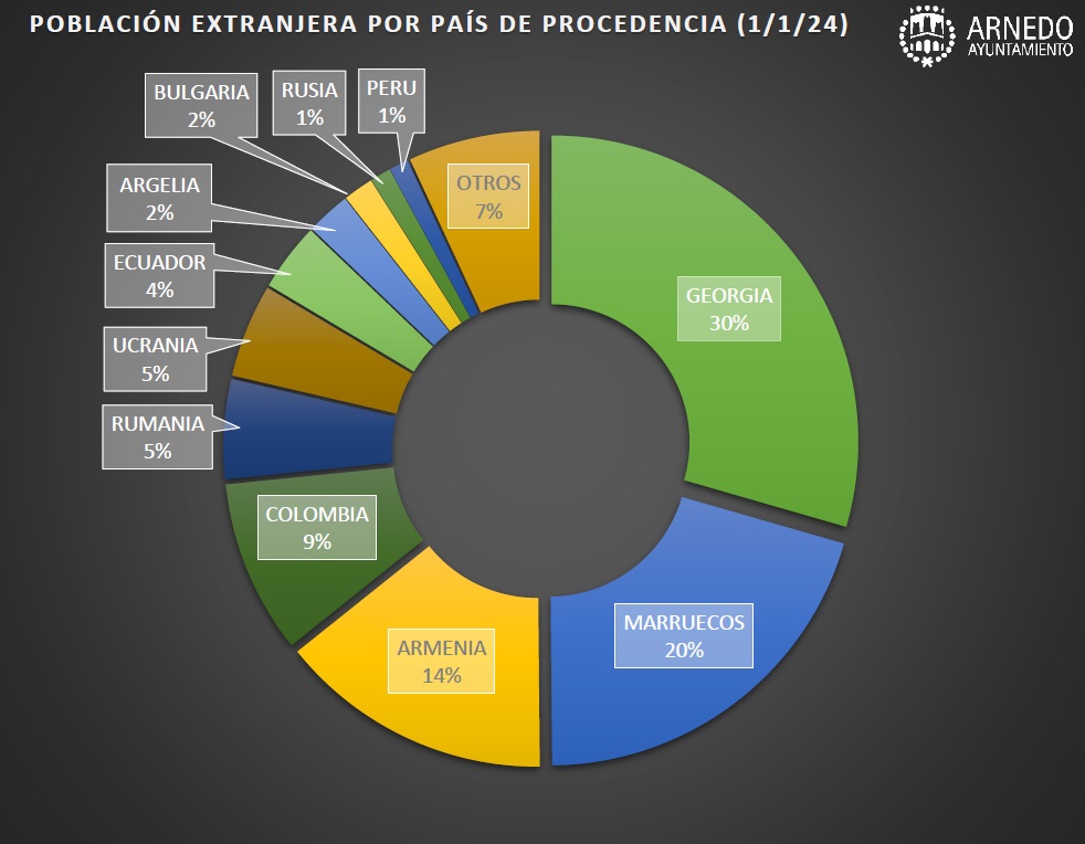 Y más específicamente, atendiendo a sus nacionalidades de origen, en Arnedo podemos encontrar un total de 44 nacionalidades distintas, siendo las más numerosas la georgiana y la marroquí, y es que tres de cada diez habitantes no españoles, provienen de Georgia (29,5%), y dos de cada diez lo hace desde Marruecos (20,4%)