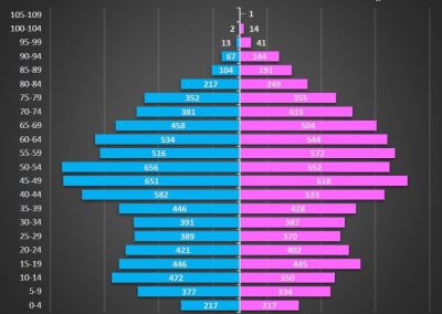De ellos, 7666 son mujeres (49,91%, 0,12 puntos porcentuales menos que hace un año) y 7692 son hombres (50,09% creciendo en el mismo porcentaje) y la media de edad de la población total se sitúa en los 42,60 años, 0,39 años más que hace doce meses. Las franjas de población que superan el millar de habitantes son las comprendidas en los tramos entre 45-49 y 65-69 años.