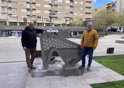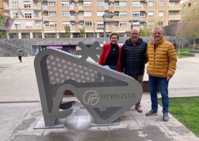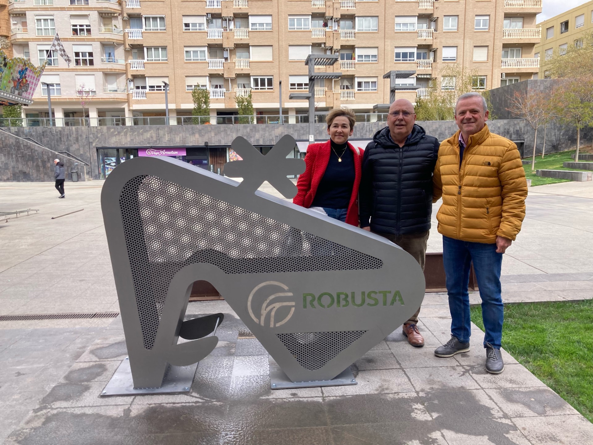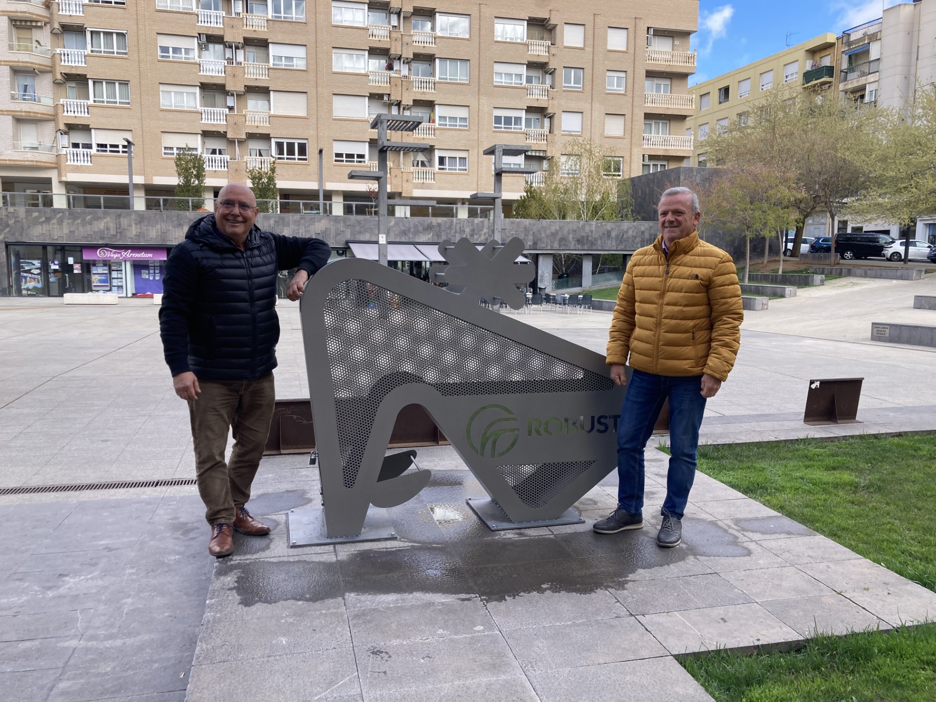 El concejal de medio ambiente, José María Ezquerro Adolfo Millán, de Calzados Robusta, han inaugurado en la mañana de este martes 26 de marzo el nuevo contenedor de reciclaje de tapones que se ha instalado en la Plaza de España y que ha patrocinado Calzados Robusta.