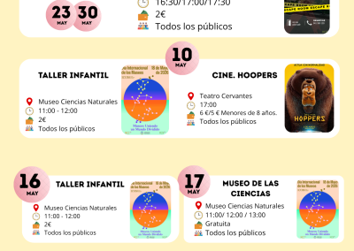 El sábado 10 de mayo será una jornada especialmente completa. Por la mañana, el museo acogerá un taller infantil de 11:00 a 12:00 horas, mientras que por la tarde el Teatro Cervantes proyectará la película Hoopers a las 17:00 horas, dentro del ciclo de cine infantil. Las entradas tienen un precio de 6 euros, con tarifa reducida de 5 euros para menores de 8 años.