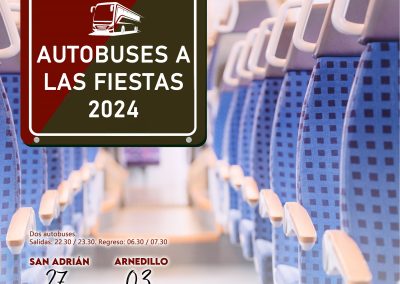 - 27 de julio- sábado: Fiestas de San Adrián (2 autobuses de 60 plazas) Salidas a las 22.30/23.30 horas. Regreso 06.30/ 07.30 horas.