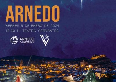 – 18:30 h. Salida de la Cabalgata de Reyes. El itinerario previsto para la Cabalgata 2024 es el siguiente: Salida desde Teatro Cervantes, Pº Constitución, posterior giro hacia la calle Pío XII hasta la calle Huertas y llegada a la Plaza de España, donde, en el escenario, los niños/as arnedanos podrán saludar a Sus Majestades los Reyes Magos y recibir sus regalos.