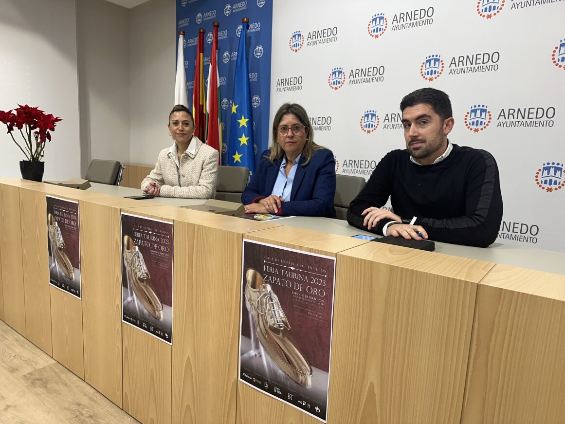 Este jueves 4 de enero de 2024, la Presidenta del Consejo Sectorial Taurino de Arnedo, Rosa Herce, acompañada por la directora General de Justicia e Interior, Tania Sáez y el Presidente del Club Taurino Arnedano, Javier Rubio han presentado la gala de entrega del XXXVIII trofeo Zapato de Oro que se celebrará el próximo sábado 13 de enero a las 20.00h en el Teatro Cervantes.