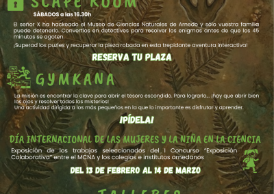 La primera de ellas es un Escape Room que se desarrolla dentro del propio museo. El objetivo es resolver distintos enigmas explorando sus salas en un tiempo máximo de 45 minutos. Está recomendado para grupos familiares o niños y niñas de entre 8 y 14 años, con un mínimo de cuatro y un máximo de ocho participantes por grupo. Se realiza los sábados por la tarde a las 16:30, 17:00 y 17:30 horas, con un máximo de tres grupos por sesión y un precio de 2 euros por persona. Durante las pasadas Navidades ya se ha probado con los alumnos ganadores del concurso de la Semana de las Ciencias Naturales. Para su desarrollo, los grupos disponen de una tablet con una aplicación creada por el propio personal del museo.