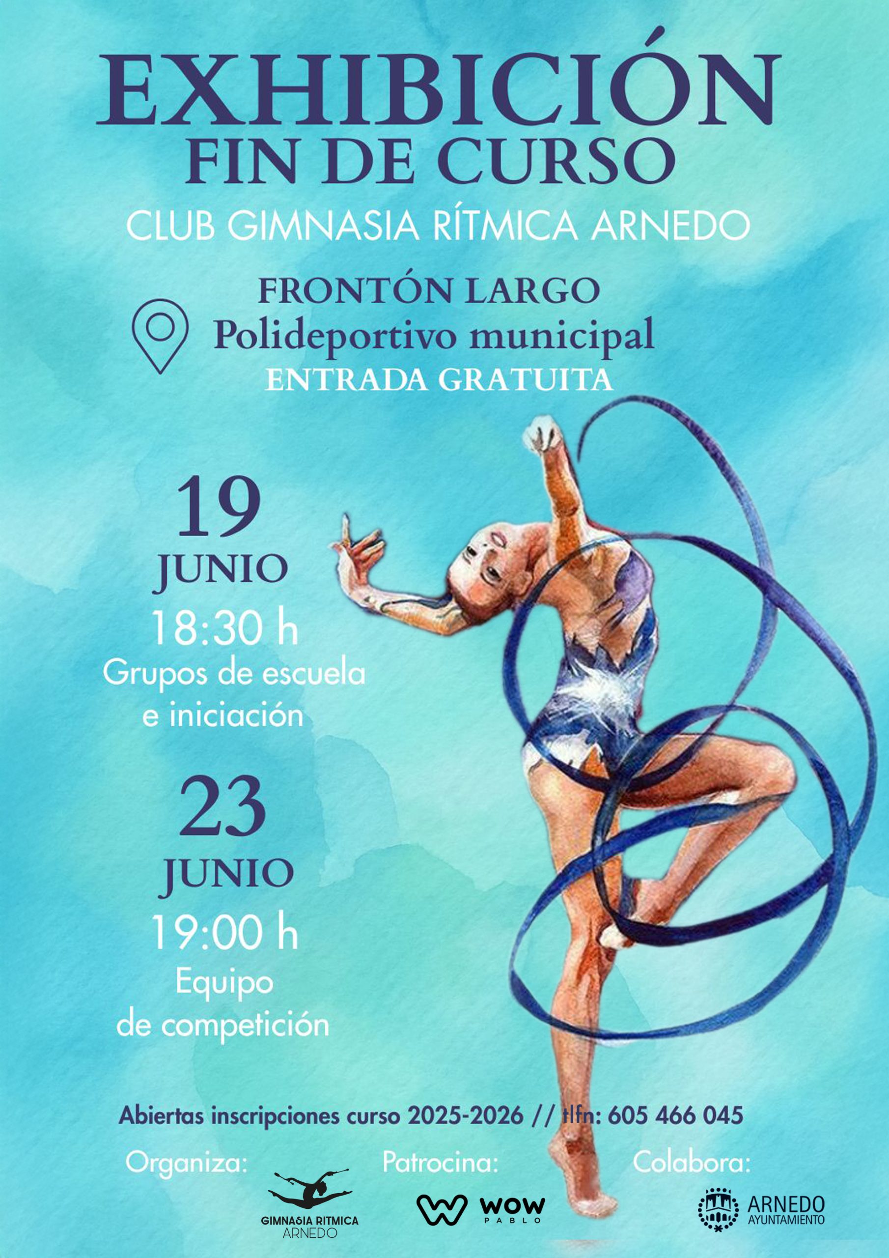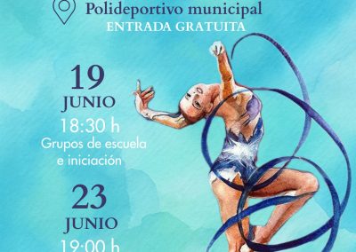 La primera exhibición tendrá lugar el jueves 19 de junio a las 18:30 horas en el Frontón Largo, con la participación de los cuatro grupos de la escuela del club. En ella actuarán niñas de entre 3 y 13 años, organizadas en dos grupos de pequeñas, procedentes de los colegios Antonio Delgado Calvete y La Estación (de 3 a 6 años), un grupo de medianas (de 7 a 9 años) y otro de mayores (de 10 años en adelante). Durante la tarde se ofrecerán un total de 14 actuaciones. Las gimnastas más pequeñas realizarán ejercicios de manos libres, mientras que los grupos más avanzados mostrarán coreografías con aparatos típicos de la rítmica como la pelota, la cinta y el aro.