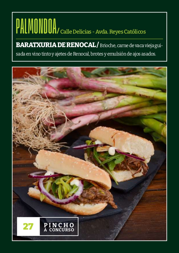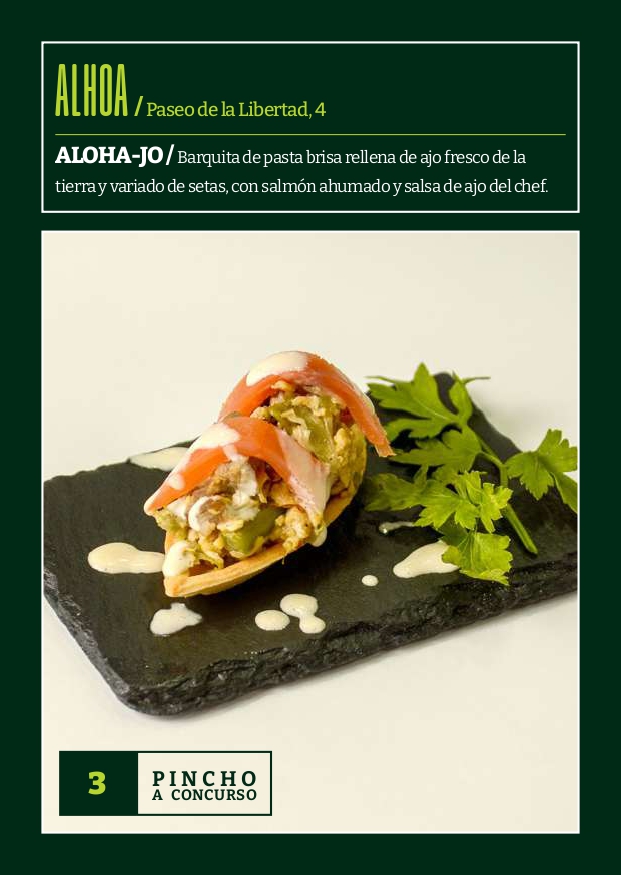 Los otros tres finalistas de esta edición han sido Aloha con su ‘Aloha-jo’, una barquita de pasta brisa rellena de ajo fresco, setas, salmón ahumado y salsa de ajo; Layma y su ‘Laymajo’, una brandadada de bacalao con gamas y ajetes y mermelada de pimiento; y Palmondoa, que presentó su ‘Baratxuria de Renocal’, un brioche relleno de carne de vaca al vino tinto, ajetes, brotes y emulsión de ajos asados.