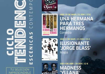 Además, el ciclo contará con una propuesta especialmente pensada para el público aficionado al humor gestual: el espectáculo “Madness”, de la compañía Yllana. Esta función tendrá lugar el 4 de abril a las 20:30 horas y combinará música y humor en el estilo característico de la compañía.