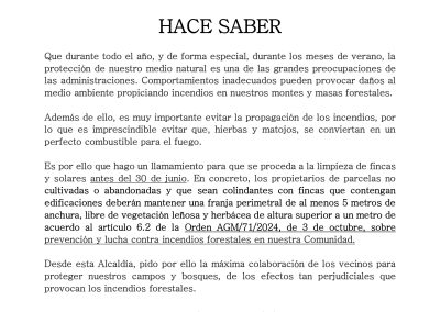 Para prevenir estos riesgos, el Ayuntamiento hace un llamamiento a todos los propietarios de parcelas no cultivadas o abandonadas —sobre todo aquellas colindantes con fincas edificadas— para que realicen labores de limpieza y desbroce antes del 30 de junio. Según se establece en la Orden AGM/71/2024, estos terrenos deben mantener una franja perimetral de al menos 5 metros de anchura libre de vegetación leñosa y herbácea de más de un metro de altura.