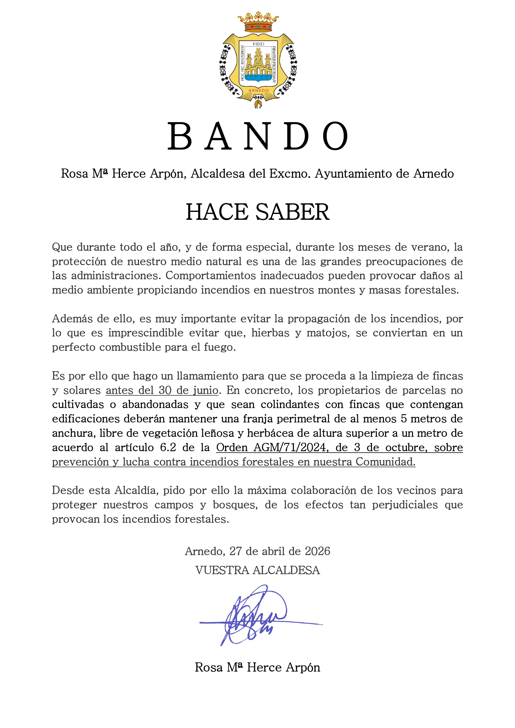 Rosa Mª Herce Arpón, alcaldesa de Arnedo, ha emitido hoy un bando municipal recordando la importancia de proteger el medio natural y evitar incendios forestales, especialmente durante los meses de verano.