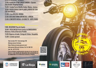 El domingo, después del desayuno en la plaza de España, se iniciará una ruta motera hasta Enciso, en donde se visitarán yacimientos de huellas de dinosaurio y el parque de paleoaventura El Barranco Perdido, antes de regresar a Arnedo, donde tendrá lugar una entrega de trofeos y la despedida de los participantes, aunque se ofrecerá también la posibilidad de compartir una comida previa.