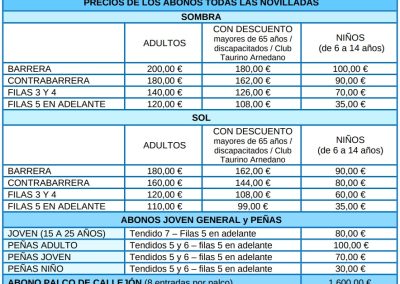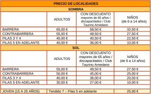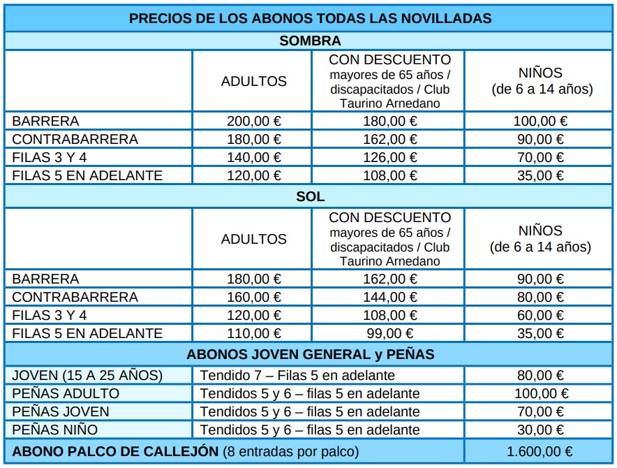 Así los precios de abonos para los cuatro festejos que compondrán el ciclo tendrán unos precios que irán desde los 200 euros de la barrera de sombra hasta los 110 euros en las filas 5 en adelante de sol (en la temporada 2023, los precios oscilaron entre los 226 de la barrera de sombra y los 124 euros en las filas altas de sol). Además se establecerán descuentos del 10% para mayores de 65 años, discapacitados y socios del Club Taurino, así como un descuento del 50% en el precio de entradas para los niños de 6 a 14 años (a excepción de las filas 5 en adelante, donde tendrán un precio único de 35 euros en todas las localidades.