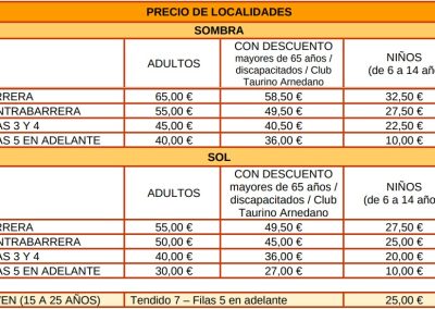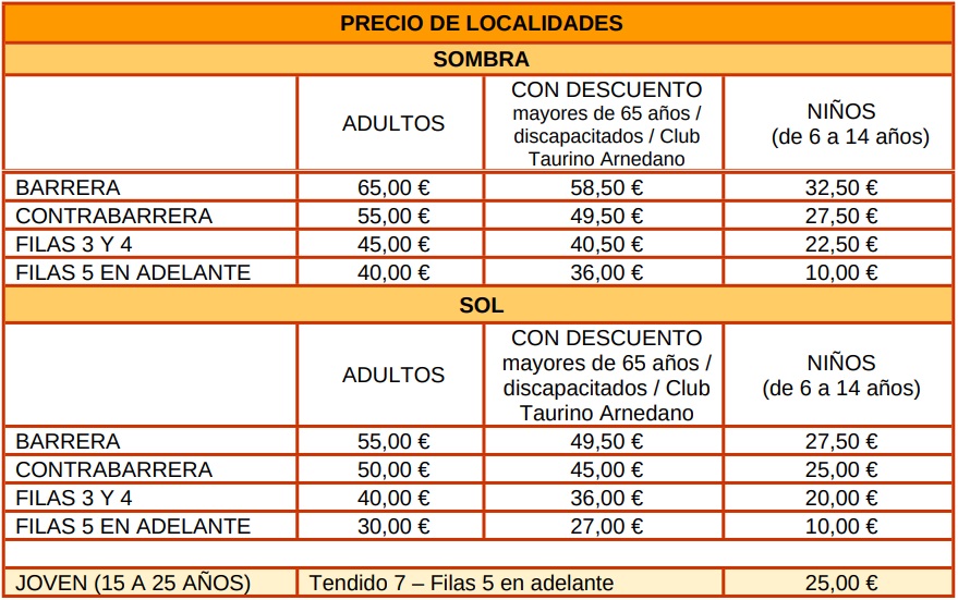 Además se establecerán precios especiales para jóvenes de entre 15 y 25 años (80 euros en el tendido 7 de la fila 5 en adelante), así como para peñas, que tendrán un precio de 100, 70 y 30 euros para adultos, jóvenes y niños respectivamente.
