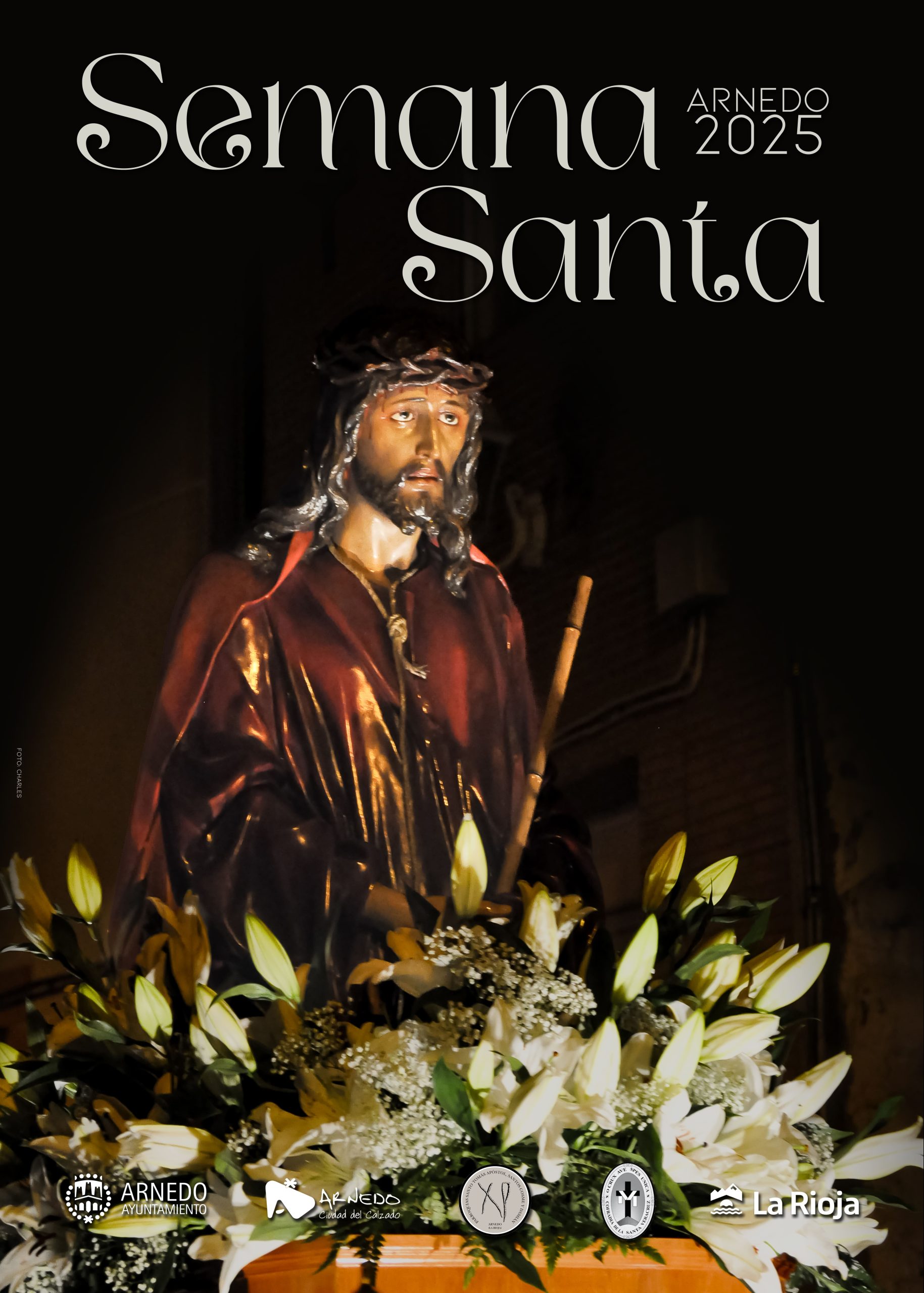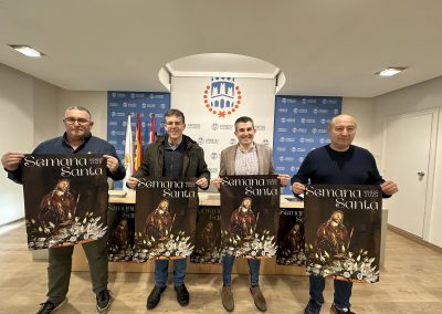 El concejal de Turismo del Ayuntamiento de Arnedo, Raúl Domínguez, acompañado por Pablo García y José Antonio Galilea de la cofradía de la Veracruz de Arnedo, y el párroco, Javier Martín, han presentado las actividades de la Semana Santa 2025, que este año celebrará sus actos entre el 13 y el 27 de abril.