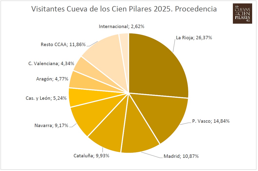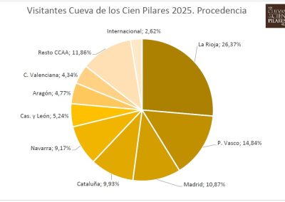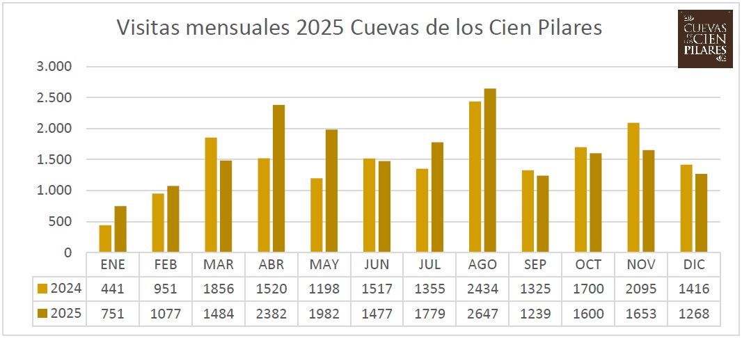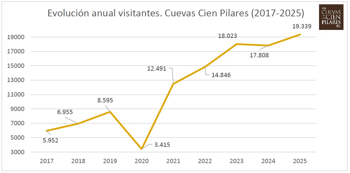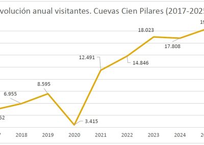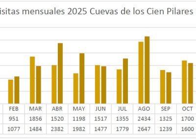Las Cuevas de los Cien Pilares continúan su consolidación y crecimiento habiéndose aproximado en este 2025 a las 1000 visitas guiadas (997) con un total de 19.339 visitantes, habiendo triplicado en 8 años las cifras de su primer año completo de apertura con una media de más de 1600 visitantes mensuales.