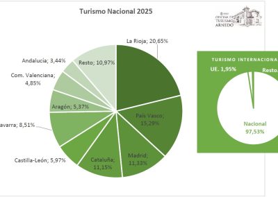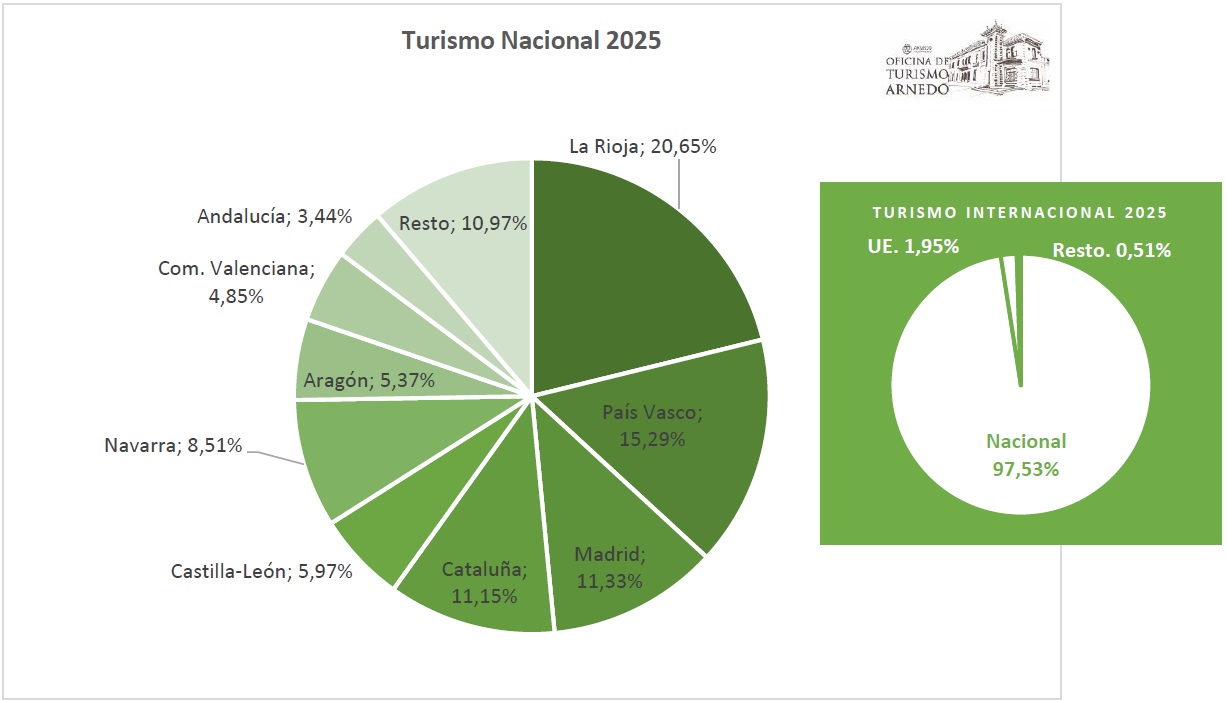 Aunque los visitantes procedentes de nuestra comunidad autónoma continúan siendo los más numeroso, el porcentaje de riojanos que visitan Arnedo continúa en disminución (baja otro 5%), así si en 2022, 4 de cada 10 visitantes eran riojanos, en 2025 son tan solo 2 de cada 10 lo son, lo que se traduce en un mayor número de visitantes de otros puntos de la geografía nacional.