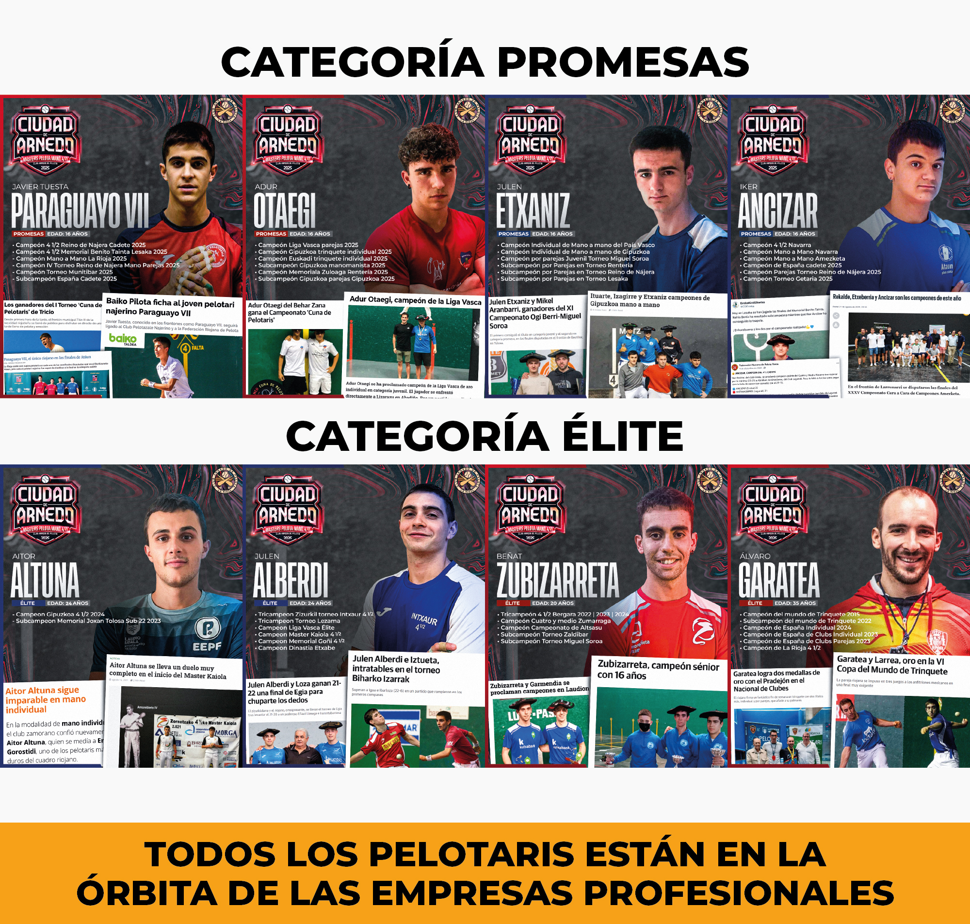 El torneo contará con dos categorías: la de promesas, en la que competirán Otaegui, Ancizar, Paraguayo VII y Etxániz, y la de élite, en la que se enfrentarán Garatea, J. Alberdi, Zubizarreta IV y Altuna. Las semifinales de ambas categorías se disputarán el viernes 26 y el domingo 28 de septiembre, mientras que las finales tendrán lugar el martes 30, en todos los casos a partir de las 17:30 horas en el Frontón Municipal.