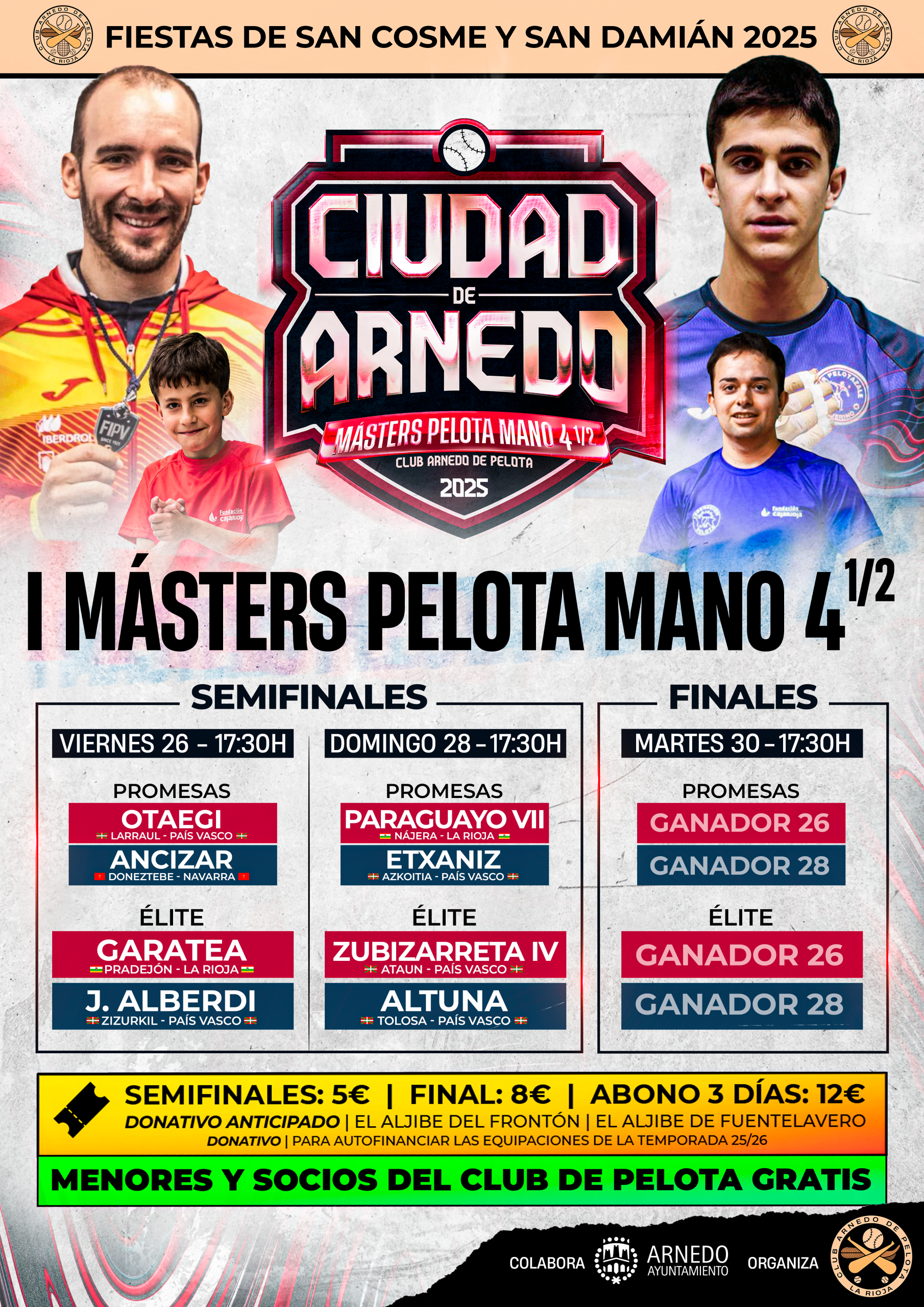 Las entradas ya están a la venta en El Aljibe del Frontón y El Aljibe de Fuente Lavero, con un precio de 5 euros para las semifinales, 8 euros para la final y un bono especial de 12 euros para asistir a todo el torneo, con el fin de que el precio no sea un impedimento para ningún aficionado. Además, los menores de edad, los socios del Club de Pelota y los integrantes de la Escuela de Pelota de Arnedo podrán acceder gratuitamente.