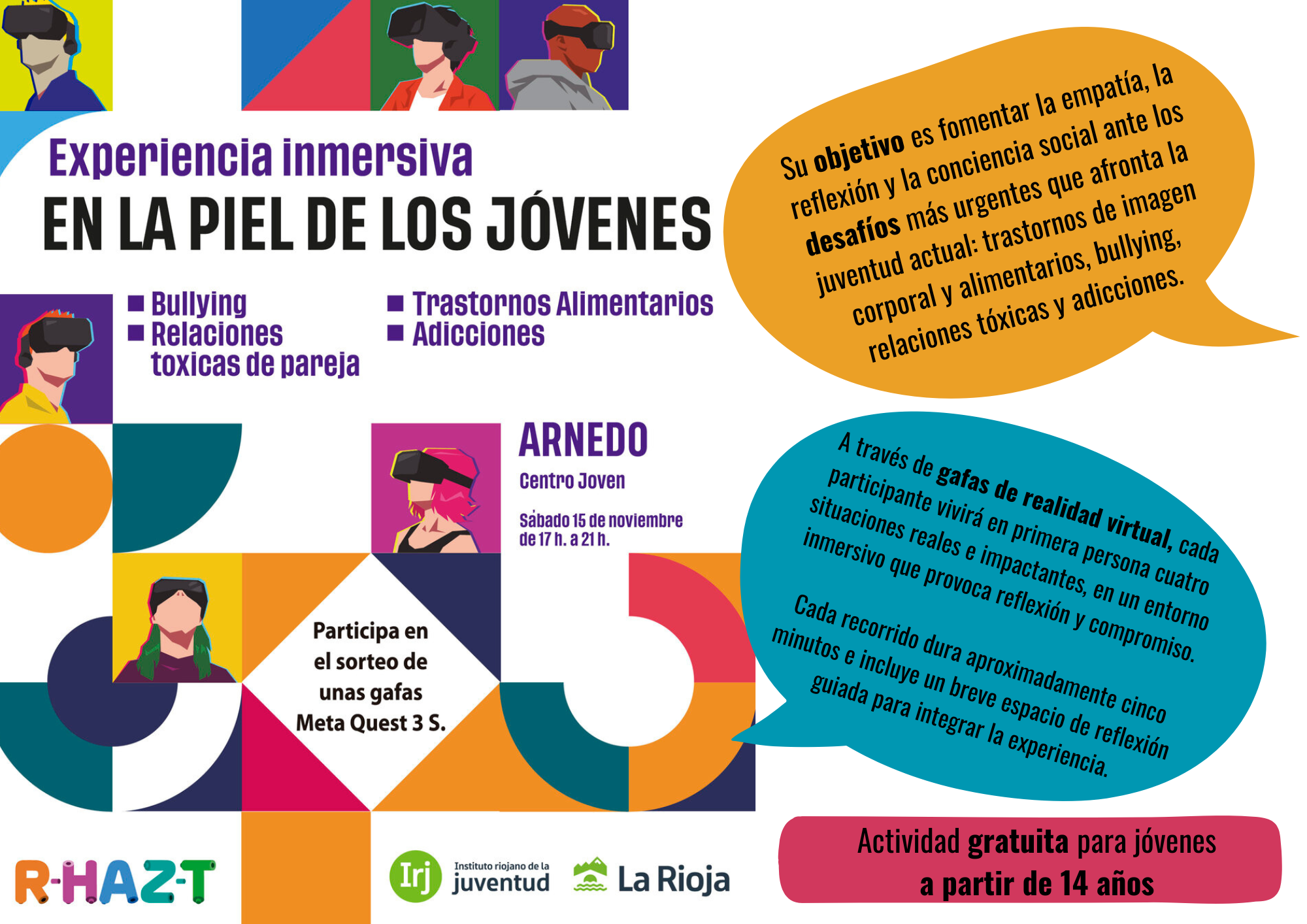 La actividad “En la piel de los jóvenes“ es una iniciativa promovida por el Instituto Riojano de la Juventud (IRJ) dirigida a jóvenes entre 14 y 35 años, que tendrá lugar el próximo sábado 15 de noviembre en el Centro joven de Arnedo, entre las 17:00 y 21:00 horas. Durante su realización, se plantea un recorrido con una experiencia inmersa a través de gafas de realidad virtual, donde cada participante se sumerge en escenarios creíbles inspirados en situaciones reales para vivir en primera persona situaciones límite vinculadas a los trastornos de imagen corporal y alimentarios, bullying, relaciones tóxicas o las adicciones, que nos debehacer pensar en qué soluciones debemos aportar para que no haya ni una víctima más. La experiencia se vive de forma individual, con una duración aproximada de cinco minutos, seguidos de un breve proceso de reflexión guiada.