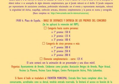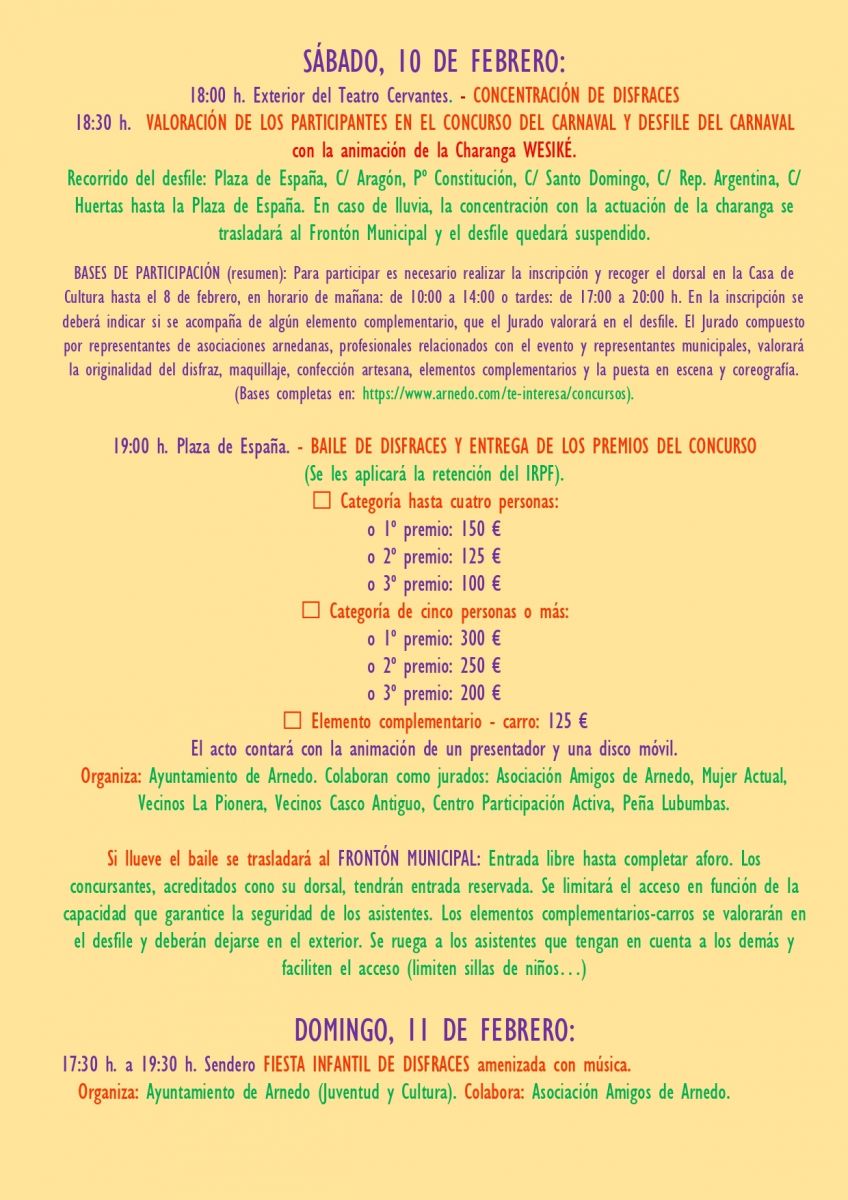 BASES DE PARTICIPACIÓN (resumen): Para participar es necesario realizar la inscripción y recoger el dorsal en la Casa de Cultura hasta el 8 de febrero, en horario de mañana: de 10:00 a 14:00 o tardes: de 17:00 a 20:00 h. En la inscripción se deberá indicar si se acompaña de algún elemento complementario, que el Jurado valorará en el desfile. El Jurado compuesto por representantes de asociaciones arnedanas, profesionales relacionados con el evento y representantes municipales, valorará la originalidad del disfraz, maquillaje, confección artesana, elementos complementarios y la puesta en escena y coreografía.