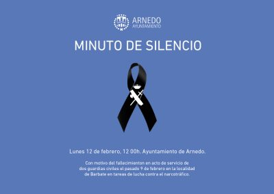 A las 12.00h de este lunes 12 de febrero de 2024, el Ayuntamiento de Arnedo se sumará al minuto de silencio convocado por la Federación Española de Municipios y Provincias con motivo del fallecimiento en acto de servicio de dos guardias civiles el pasado 9 de febrero en la localidad de Barbate en tareas de lucha contra el narcotráfico.