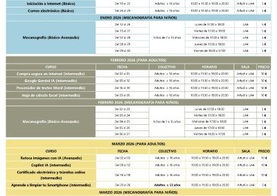 Oferta formativa de las Cibertecas municipales para los meses de ENERO, FEBRERO Y MARZO (ADULTOS Y NIÑOS) de 2026.