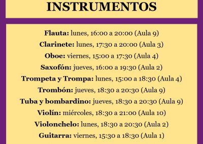 - Flauta: de 16.00 a 20.00 h. (Aula 9)