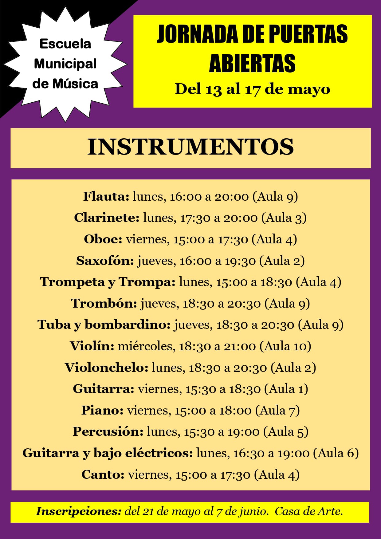 - Saxofón: de 16:00 a 19:30 h. (Aula 2)