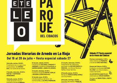 Fiesta «A la ribera del Cidacos» sábado 27 Para finalizar, el sábado 27 de julio el festival recorrerá tres lugares de Arnedo como escenarios a la ribera del Cidacos. Aqueteleo en la piscina (piscinas municipales) donde tendrá lugar un taller de arte y poesía con Pigmento y el recital en el agua de Coke Martínez. La tarde en el parque del Cidacos con el citado campeonato de slam, y la subcampeona de Europa Mamá Fiera más el encuentro con Antonio Cillóniz y Juanjo Carracedo, para cerrar con el concierto de kraut rock Veta dúo y la sesión de Dj Manoplas en Sendero.
