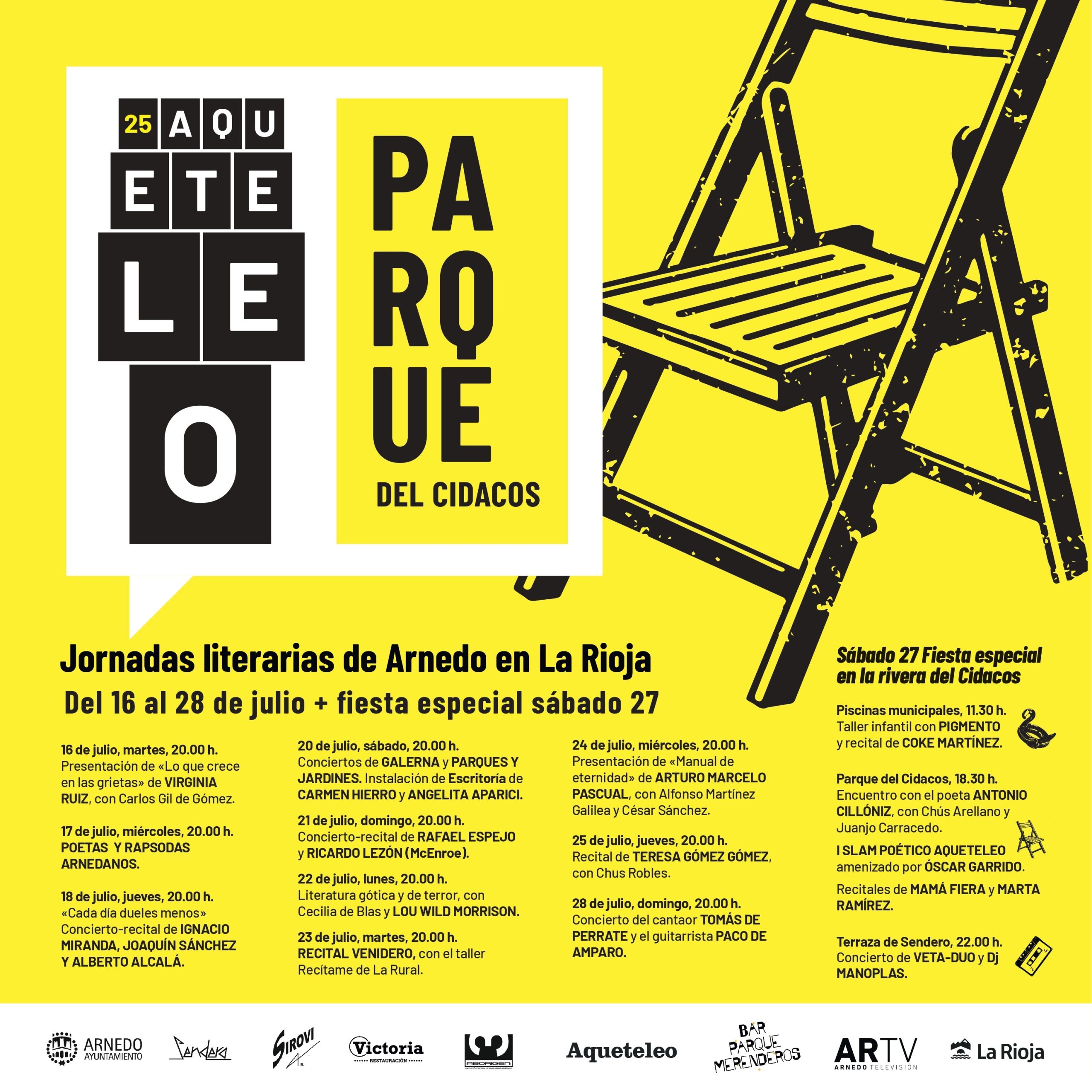 Tras celebrar la Semana de la memoria y comenzar con los actos de Aqueteleo en la Terraza, se presenta la programación que, en el habitual escenario del Parque del Cidacos, se desarrollará este verano durante casi dos semanas, del 16 al 28 de julio. Tomás de Perrate, Galerna, Veta Duo y Parques y Jardines, o Ricardo Lezón con su música. Rafael Espejo, Ignacio Miranda, Antonio Cillóniz, Teresa Gómez Gómez, Marta Ramírez, Coke Martínez o Mamá Fiera con la poesía y la prosa de Lou Wild Morrison y Virginia Díaz, serán algunos alicientes de la cita. Dos instalaciones efímeras en el parque y en la piscina y una exposición en la Casa del Arte enmarcan este mes de julio en Arnedo dedicado a las artes y las letras.