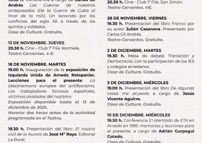 -Día 10 de diciembre, miércoles a las 19:30 h. Casa de Cultura – Charla: El Atentado de ETA en Arnedo 1995: memoria y lecciones para el presente, a cargo de Adrián Gurpegui Cotado.