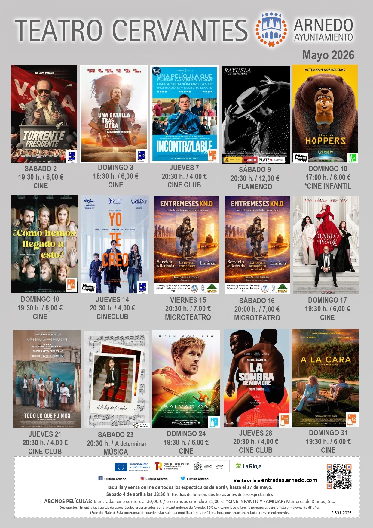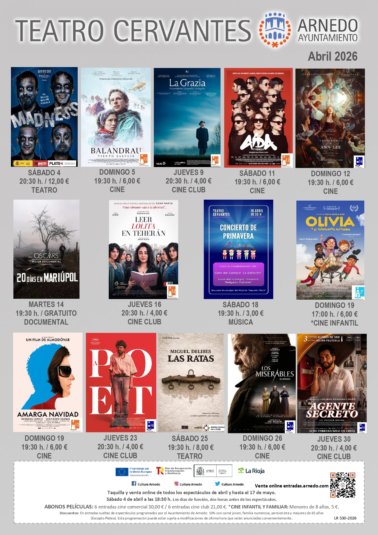 Las entradas para la programación de abril estarán disponibles a partir del sábado 4 a las 18:30 horas, tanto en taquilla como a través de la web entradas.arnedo.com.