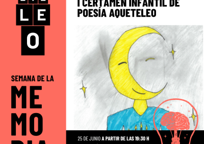La Semana de la Memoria comenzó en la tarde de ayer con la entrega de premios del I Certamen de poesía infantil Aqueteleo en el escenario habitual de estas jornadas literarias: el parque del Cidacos. El premio que se entregó a niños y niñas de 5º y 6º de primaria consistió en el primer placard o librito que reúne sus poemas y dibujos en una edición impresa. El acto se inauguró a las 19:30h con el concierto de Combo Teen, continuó con la lectura de los poemas ganadores y cerró con la banda juvenil The Yeyck Black, ambos grupos de la Escuela Municipal de Música.