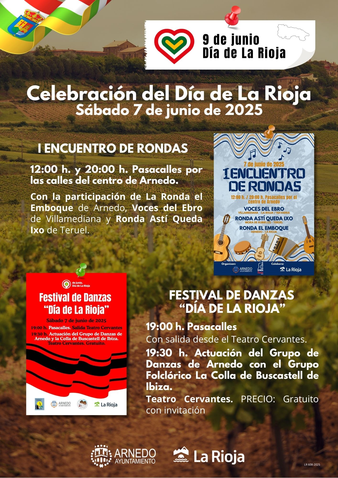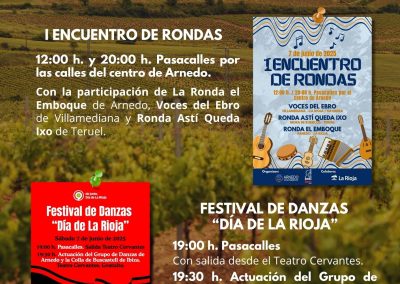 El Grupo de Danzas de Arnedo se creó en el año 1.983, con el fin de recuperar y promocionar las danzas y vestimentas de Arnedo y La Rioja. Así consiguió con éxito recuperar la jota de Vueltas de Arnedo y traje típico de San juanera de la ciudad, traje que vuelven a vestir los romeros de la romería de San Juan que se hace al Monasterio de Vico en carros engalanados con ramas de chopo verdes y guirnaldas y flores.