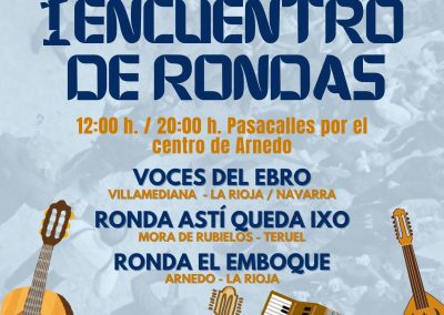 La Ronda El Emboque -Arnedo–Surgió en el año 2005 en Arnedo, es un grupo musical cuyo espíritu se basa en el folklore popular. Les gusta mezclarse entre la gente y cantar. Desde ese arraigo popular de calle, y con el objetivo de salvaguardar el patrimonio oral y musical de nuestras tierras, editaron en enero de 2007 su primer CD ‘tradición y folklore’. El 10 de junio de 2009 presentaron su segundo disco ‘entre campos y bodegas’, que contiene 14 canciones, recuperadas de cantinas de los años 40, adaptadas o de nueva creación, como la que aparece en primer lugar, ‘los romeros de San Marcos’.