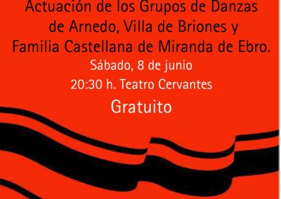 20:30 h Teatro Cervantes.-Actuación del Grupo de Danzas Familia Castellana de Miranda de Ebro (Burgos) y Villa de Briones acompañados del Grupos de Danzas de Arnedo.