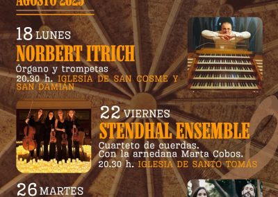 El viernes 22 de agosto, la música de cámara tomará el escenario de la Iglesia de Santo Tomás a las 20:30 horas con la actuación del Stendhal Ensemble. Esta agrupación, formada exclusivamente por mujeres españolas con formación en prestigiosas instituciones como el Real Conservatorio Superior de Música de Madrid y el Conservatoire Royal de Bruxelles, ofrecerá un programa que reflejará la pasión de sus integrantes por la música de todas las épocas. Entre las componentes se encuentra la arnedana Marta Cobos, lo que añade un toque local a la velada. El ensemble tiene una amplia trayectoria internacional, habiendo actuado en importantes escenarios de Europa, África y Asia, incluidos el Auditorio Nacional de Madrid y el Royal Albert Hall de Londres.